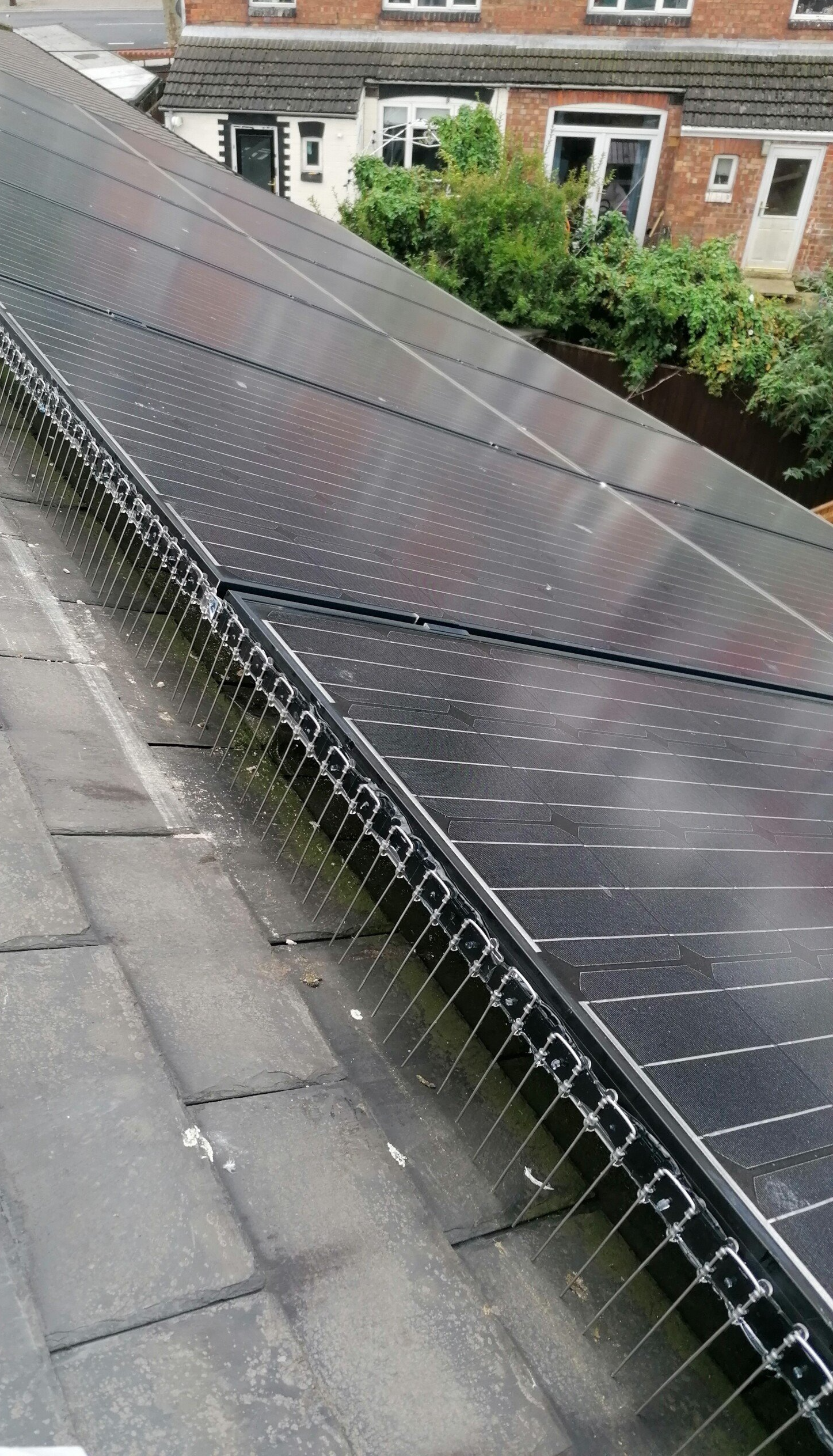 In recent years the UK has seen a huge increase in the installation of roof top solar panels. Unfortunately, these panels have also provided pests such as birds (especially Feral Pigeons) and Grey Squirrels a perfect place to nest underneath. The noise from pigeons can be a huge nuisance and droppings created can also continuously block gutters and cause a slip hazard below. Droppings on top of the panels will also dramatically reduce the effectiveness of the panels. We can provide you with a permanent solution to this problem. We professionally install solar panel spikes or mesh to keep pests from under your solar panels.
